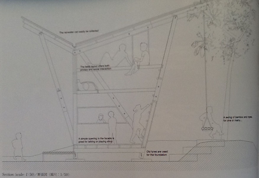 Like within exemplar section 1, the 1:50 section predominately shows the activities that will occur within the building. From the section below it is evident that this is a sleeping facility for the orphans; no doubt one of many within the camp that will each house 4 children. This small building also has also been designed to allow the children to play inside and outside (swings) and captures water through roof drainage.